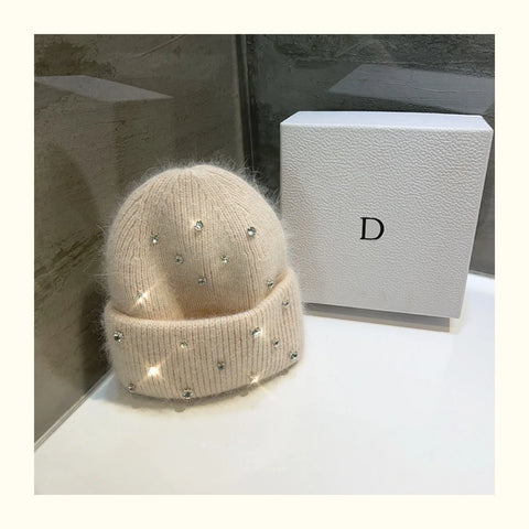 Luxury Rhinestone Beanie – Rabbit Fur Wool Knit Hat – Thick Warm Korean Fashion