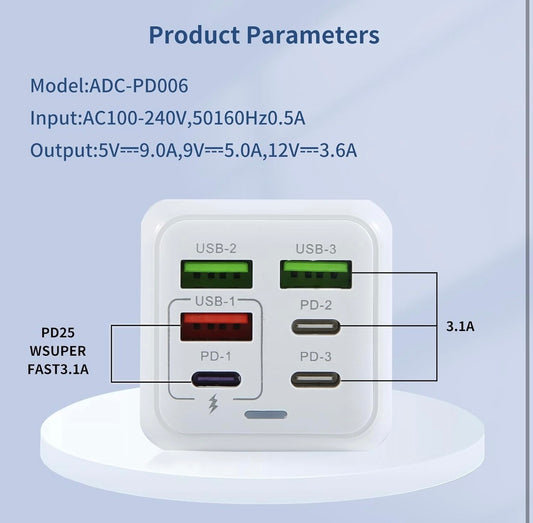 USB Plug Charger, 150W 6-Port Multi Charging Power Adapter with PD 25W Power Adapter QC 3.0 Fast Charging Plug for iPhone Android (white)