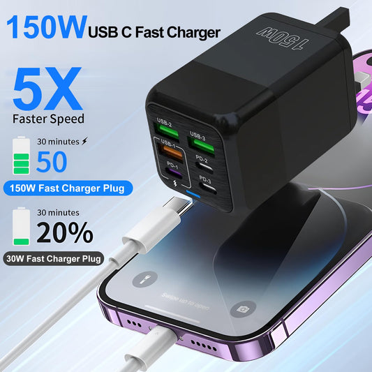 USB C Plug Fast Charging, USB C Plug, 150W Fast Charger Plug, 6-Port Charger (3PD Type C port+3QC USB A port), UK wall charger charging plug, compatible with iPhone 11/12/13/14/15 series/XS/XR/8/iPad